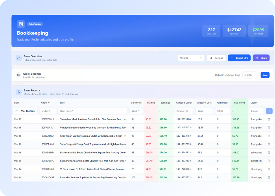 Built for eBay and Poshmark sellers, DropFlowLister helps simplify profit tracking, improve record keeping, and give you clearer visibility into your day-to-day business. As your store grows, you can stay on top of your numbers with less manual work and more confidence.